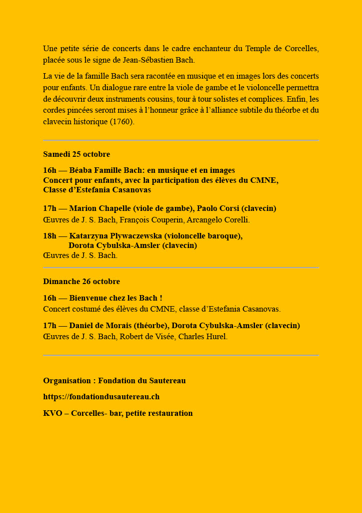 La Fondation du Sautereau a été créée par François Badoud, musicien et mécène décédé en janvier 2020. Faire vivre la musique ancienne lui tenait à cœur. La Fondation a pour mandat de poursuivre ses objectifs à savoir : promouvoir le clavecin , son histoire et sa facture en organisant des conférences et des rencontres entre musiciens, musicologues et facteurs d’instruments , mais aussi des concerts pour tout public. Il a légué à la fondation ses quatre instruments historiques pour qu’ils soient accessibles aux clavecinistes, que soient organisées des Master Class et que des enregistrements continuent à les faire vivre.